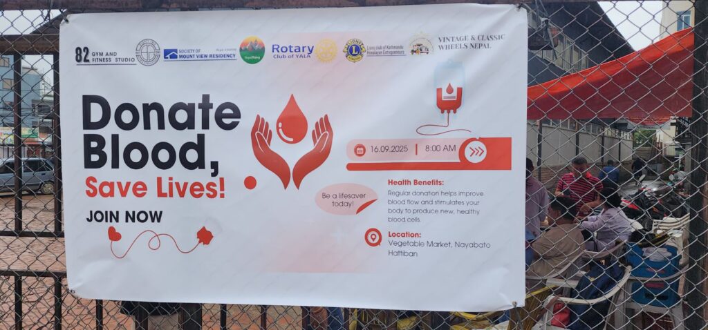 Rotary Club of Yala successfully organized a blood donation program in collaboration with 82 Gym & Fitness Studio, Vintage & Classic Wheels Nepal, and the Society of Mount View Residency on 16th September at the Vegetable Market, Hattiban, Lalitpur.