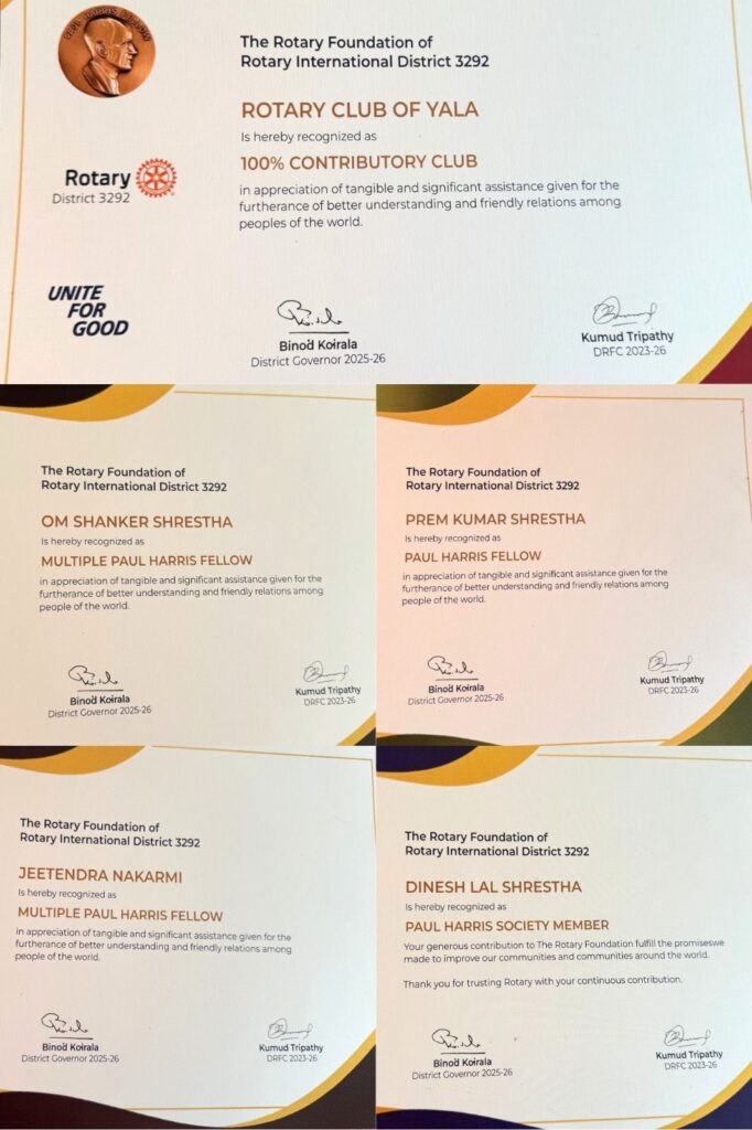 On 28th November 2025, President Rtn. Om Shanker Shrestha and Past Presidents Rtn. Deepak Kumar Shrestha and Rtn. Shobha Shrestha from the Rotary Club of Yala attended the Rotary Foundation Seminar & Recognition Program organized by District 3292.