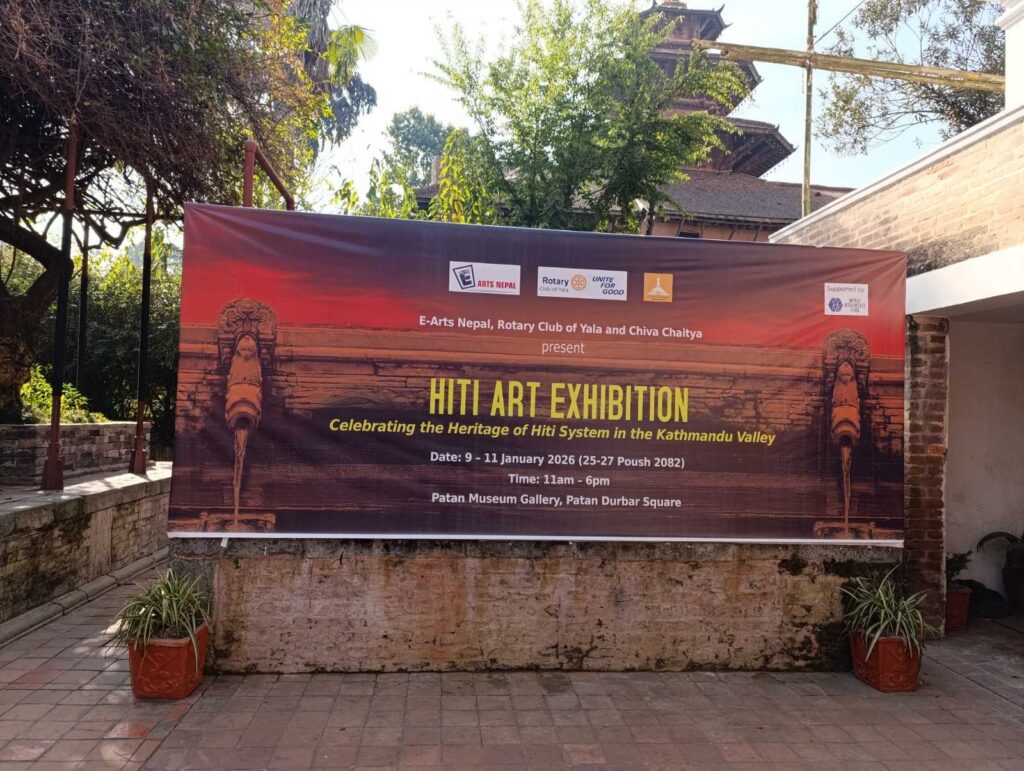 A three-day Hiti Art Exhibition, organized by the Rotary Club of Yala, in collaboration with E-Arts and Chiva Chaitya has been inaugurated by Chief Guest,the iconic artist Mr. Kiran Manandhar and Special Guest,Hiti Pranali expert Mr. Padam Sundar Joshi today.The exhibition featured artworks on Hiti (stone spouts) created by 20 emerging and young artists and is being held at Patan Museum, Patan Durbar Square, starting on 9th January 2026 tilll 11Jan 2026.The event aimed to raise awareness about Hiti conservation and the importance of preserving our cultural heritage through art. The exhibition is open for Public with free entrance!