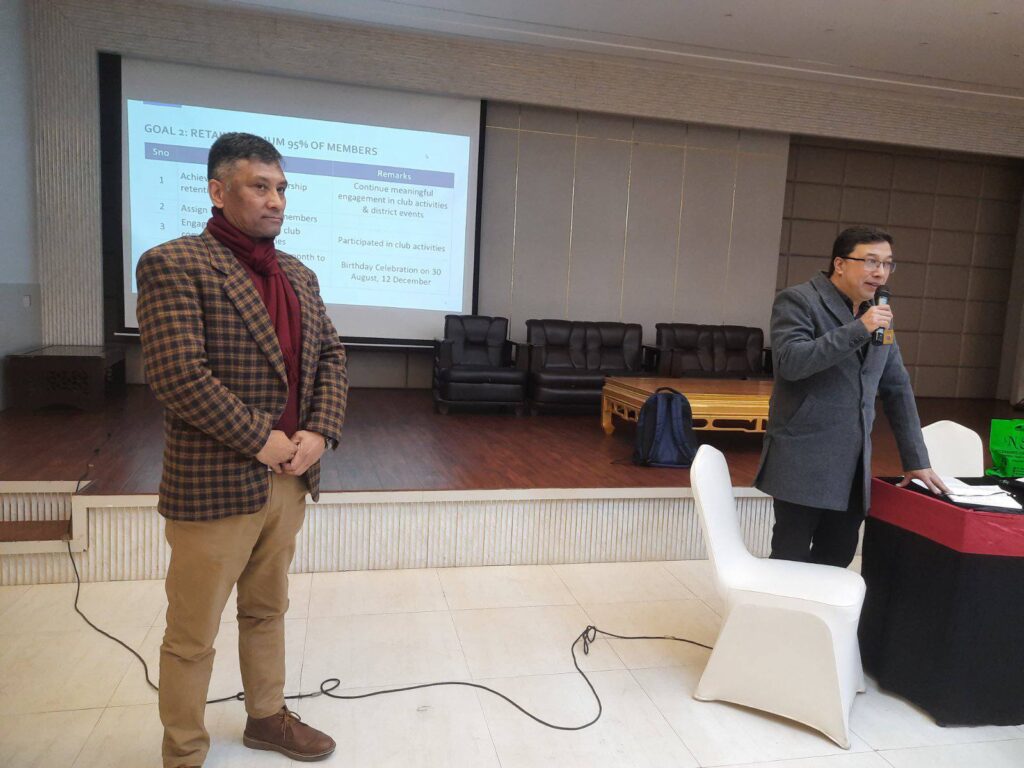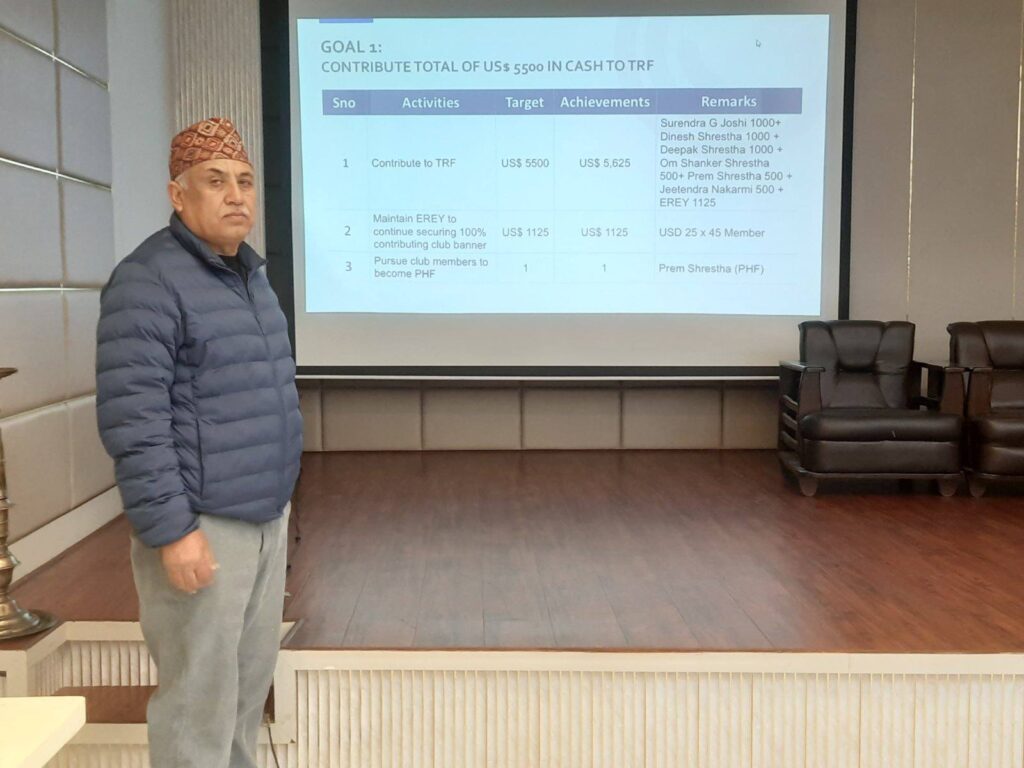 Presentations on goals and achievements to date were delivered by the respective standing committees’ chair/member: Rtn. Rina Shrestha (Member, Club Administration), Rtn. Sanjay Shrestha (Chair, Membership), Rtn. Om Krishna Shrestha (Chair, TRF), Rtn. Dinesh Lal Shrestha (Chair, Service Projects), and Rtn. Minu Pradhan Shrestha (Chair, Public Image).